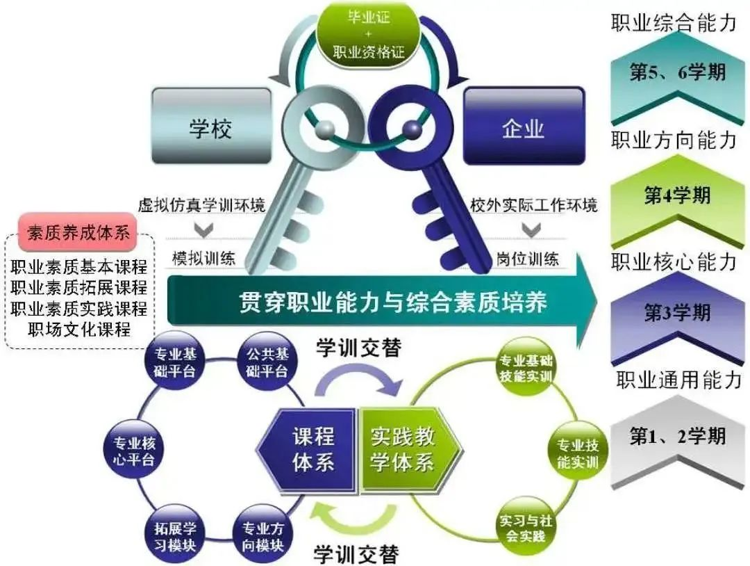 第一、二学期着重强化学生的职业通用能力,第三学期着重强化学生的职业核心能力;第四学期结合订单培养和学生的职业方向选择,着重培养学生的职业方向能力,要求学生掌握所选方向模块的知识和技能,并考取相应的职业资格证书;第五、六学期是学生顶岗实习与毕业设计阶段,着重培养学生的职业综合能力,使学生了解企业文化、掌握职业岗位所需要的实际知识、技能和素养,全面提升学生的从业素质。