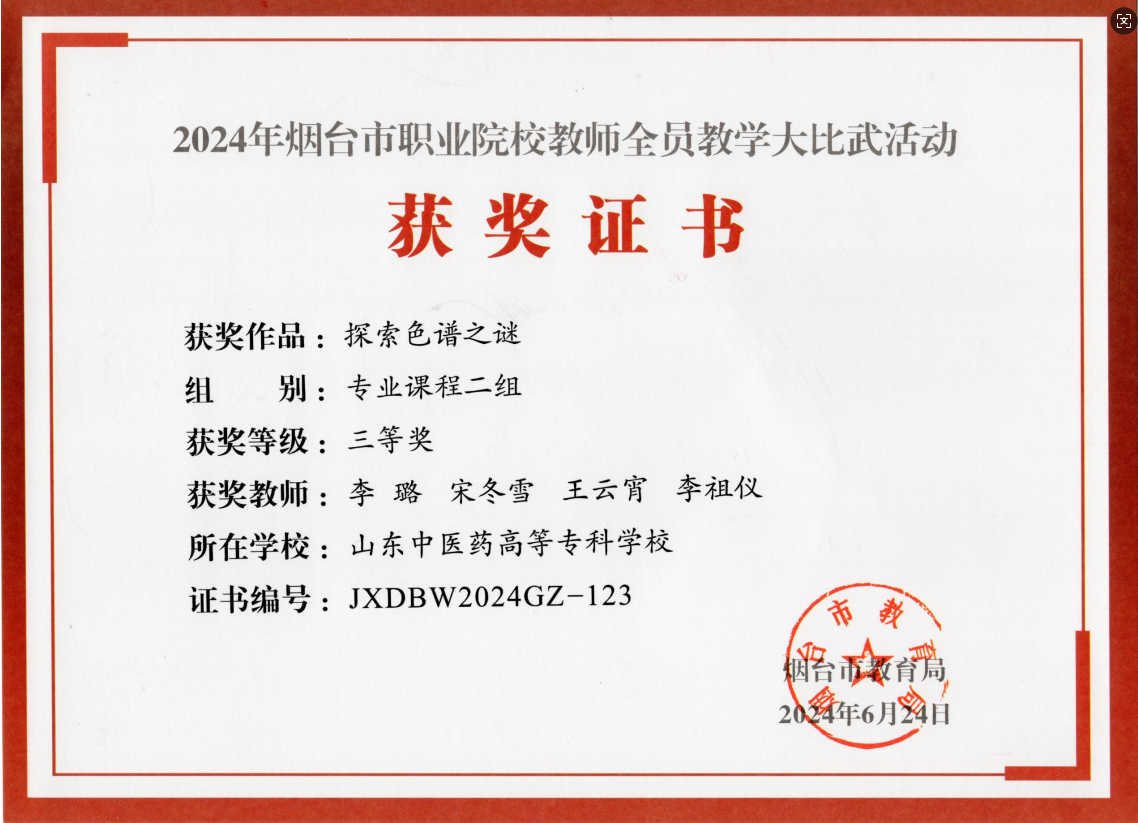 2020年以来教师主持《产教融合背景下高职院校"双师型"教师培养路径研究》山东省企业培训与职工教育重点课题、《多元协同、图谱赋能、持续改进:高职中药学专业升级路径研究与实践》山东省职业教育改革研究等省部级教改课题2项。