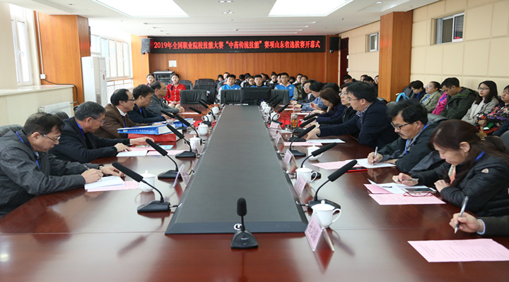 4月6日,2019年山东省职业院校技能大赛高水平技能协作训练组“中药传统技能”赛项集训选拔赛开幕式在我校综合办公楼15楼会议室举行。赛项裁判员、我校及山东医学高等专科学校、山东药品食品职业学院、济南护理职业学院、青岛职业技术学院、淄博职业学院、莱芜职业技术学院七所院校的指导老师、参赛选手参加会议。学校校长袁志勇出席会议并致辞,学校副校长战文翔主持会议。