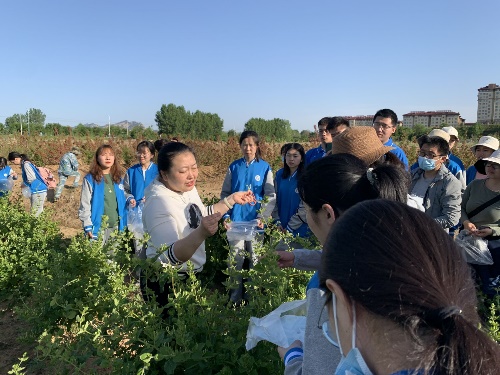 陈老师说:“我校国家万人计划教学名师张钦德教授,一直致力于金银花、北沙参等道地药材的良种选育、规范化种植与质量控制,获得‘全省金银花产业发展创新发明奖’和‘山东省中医药科学技术二等奖’,指导多地建设示范种植基地超过三千亩,成为‘把论文写在祖国大地上、把科技成果应用在实现现代化’伟大事业的真实践行者。”一堂脚踏实地的实践课,在劳动中强健了体魄,在讲授中触动了心灵,实现了“知识传授”和“价值引领”的融合统一。站在充满药草芬芳的田间地头,同学们深刻地认识到自己所学知识将是中医药事业发展壮大的坚实基础,认识到个人发展应该融入到中医药事业发展中去,并就此展开深入的思考和热烈的讨论。