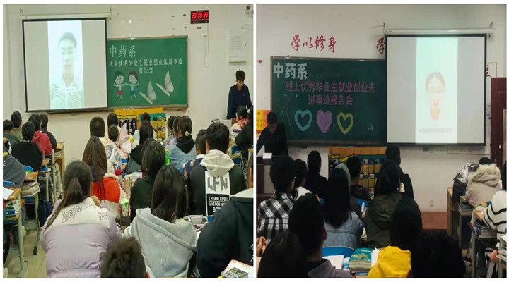 报告会邀请了2020届优秀毕业生孙悦和许新鹏,通过网络平台线上为中药系学生分享他们在创业过程中的事迹。孙悦目前已经成长为山东漱玉平民股份有限公司临沂区的区域经理,她用生动风趣的语言,为同学们分享了自己的工作经历和典型故事,以自身经历告诉了同学们踏实肯干、努力拼搏、不断学习的重要性。许新鹏毕业后创业,成立了一家中药材销售公司,目前公司年销售额500多万元。许新鹏从大学期间勤工俭学时产生的创业想法讲起,讲述了自己的创业经历,分享了人格修养、创业素质等方面的十条经验。他认为,一个人首先要树立人生目标,然后要朝着这个目标努力做事,不管遇到多大困难,心中的信念不能动摇。