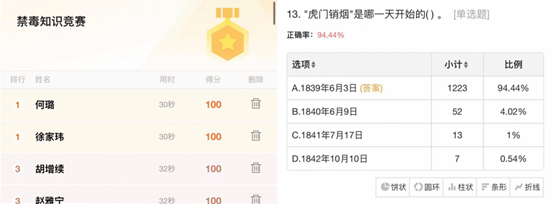 活动通过线上方式开展,题目涵盖毒品的种类、危害、预防及法律法规等多个方面,旨在普及毒品预防知识,引导学生树立正确的价值观,远离毒品危害,健康成长。同学们热情高涨,通过指定平台完成了禁毒知识答题活动,答题系统实时生成成绩报告,方便同学们了解自己关于毒品知识的掌握情况,有针对性的查缺补漏,校园内弥漫着一股浓厚的禁毒学习氛围。