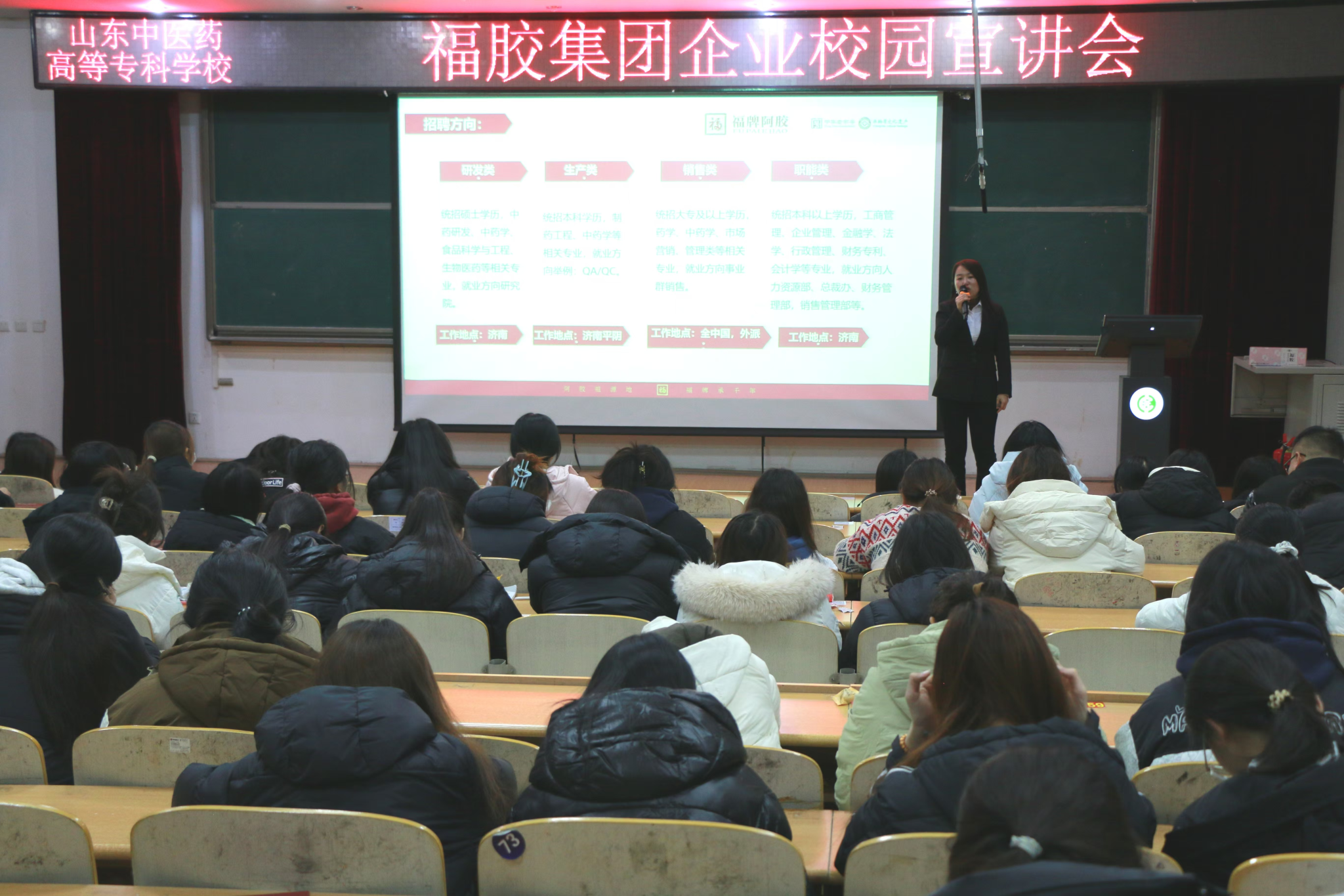 12月10日,福胶集团在教学楼102学术报告厅举办校园宣讲会。福胶集团人力资源部经理董莎莎到校宣讲,中药系辅导员、实习负责人及2023级学生参会。