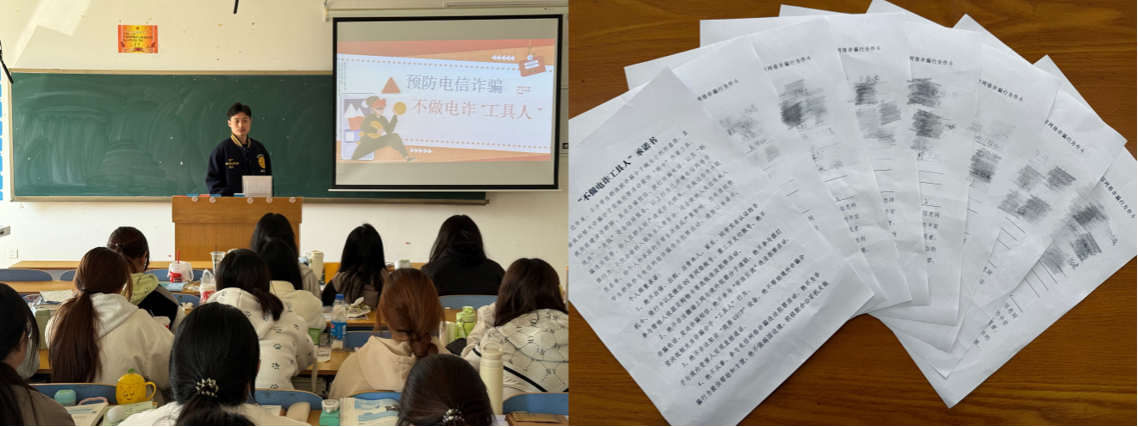 班会中,各辅导员向同学们详细介绍了当前电信诈骗的严峻形势以及常见的诈骗手段,并针对出借、出售手机卡、银行卡这一学生易忽视的风险点,进行了重点讲解。最后,全体同学认真阅读了“不做电诈工具人”承诺书,并郑重地签下了自己的名字。表达了坚决抵制电信诈骗、守护自身财产安全和校园安全的决心。