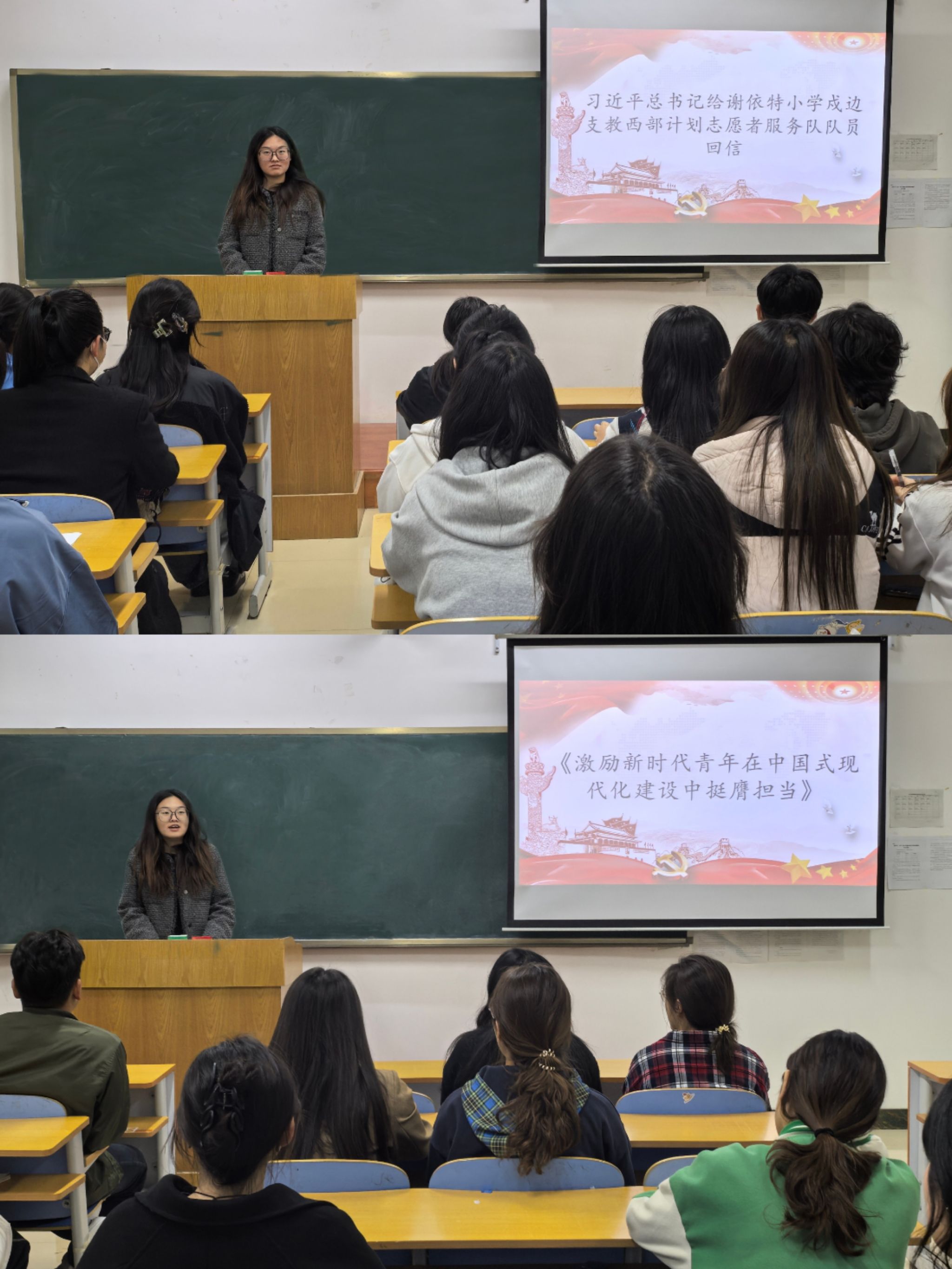 在专题学习会上,同学们通过读原文、视频学习、分组讨论等形式,重点学习了习近平总书记给谢依特小学戍边支教西部计划志愿者服务队队员的回信精神,并深入研读了《激励新时代青年在中国式现代化建设中挺膺担当》重要文章。学习过程中,同学们结合专业,就如何将个人发展融入国家战略进行了热烈讨论。