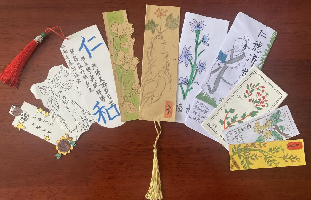 活动开启后,同学们以专业所学为灵感源泉,将一味味中药材巧妙融入书签设计中。有的在书签中加入关于中药的经典名言,搭配手绘的人参、甘草等药材简笔画,传递出中医药文化的深厚底蕴;还有的将“德润杏林长,仁心化药香”等作为书签寄语,彰显了未来中医药人的责任与担当。