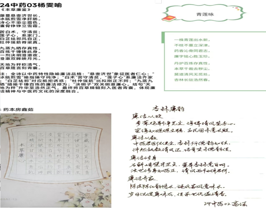 本次活动以“廉洁”为核心,以“诗歌”为纽带,充分结合中药专业特色,鼓励学子从中药典籍、本草文化、古今廉洁人物故事中汲取灵感,用文字诠释对“廉”的理解。活动发布后,各班级迅速掀起创作热潮,经过系部严格评审,24级中药学2班高涵的《杏林廉韵》和24级药物制剂技术班霍子怡的《青莲咏》荣获本次比赛一等奖。
