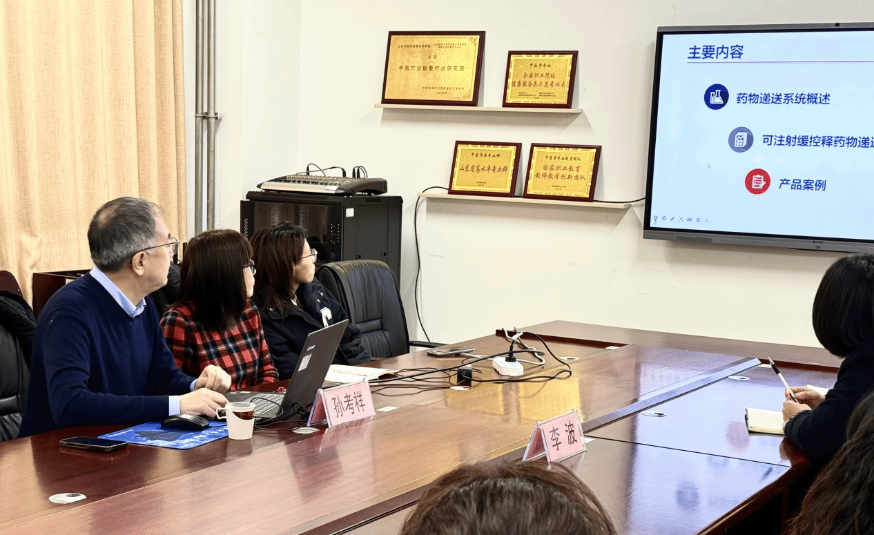 孙考祥以自身的实践探索为基础,主要围绕药物递送系统概述、注射缓控释药物递送系统展开讲座,通过产品案例,更直观地展示相关科研成果。老师们就产教融合、科研选题、项目申报等议题,与孙教授进行了深入交流与探讨。