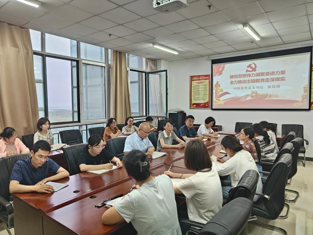 徐迎涛书记以《感悟思想伟力凝聚奋进力量,全力推动主题教育走深走实》为题,从习近平新时代中国特色社会主义思想是我们认识世界和改造世界的强大思想武器;提高政治站位,全面系统学习习近平经济思想的核心要义、精神实质、丰富内涵、实践要求;以党的创新理论为指引,不断提高新时代教师为党育人为国育才的能力等几个方面,对扎实推动中药系的全面高质量发展提出了一系列建设性意见和建议。