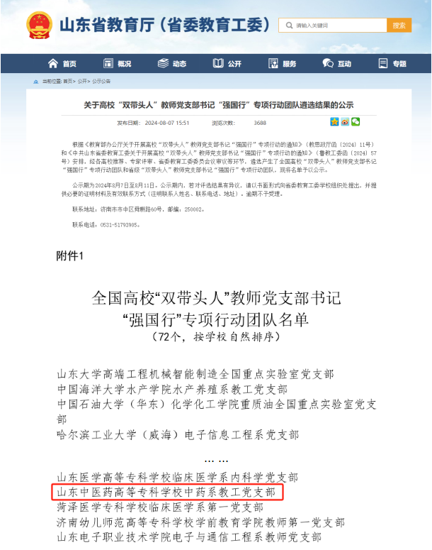 中共山东省委教育工委公布了高校“双带头人”教师党支部书记“强国行”专项行动团队遴选结果,学校中药系教工党支部成功入选。
