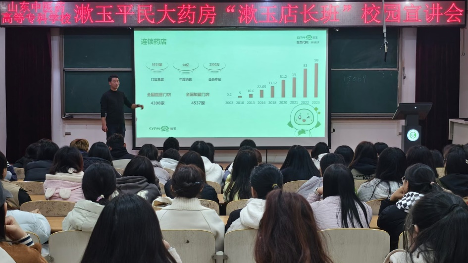 11月14日,漱玉平民大药房连锁股份有限公司在教学楼一楼报告厅举办“漱玉店长班”校园宣讲会。漱玉平民人力资源部经理王俊到校宣讲,中药系教师、实习负责人及2023级学生参会。