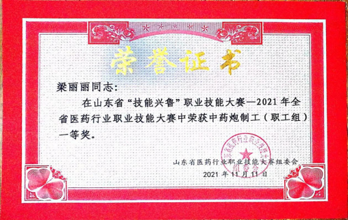依托职教优势,深化产教融合,夯实“双师型”教师团队,完善多层次技能人才培养体系成员。获山东名中医药专家称号1人,全国职业院校技能大赛优秀工作者3人,优秀指导教师2人;获山东省“技能兴鲁”职业技能大赛中药炮制工比赛一等奖4人;山东省青年技术能手称号1人,山东省技术能手称号2人。