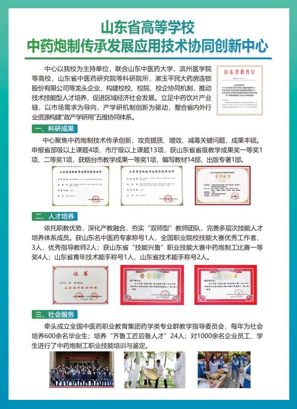 中心聚焦中药炮制技术传承创新,攻克提质、增效、减毒关键问题,成果丰硕。申报省部级以上课题4项,市厅级以上课题13项,获山东省省级教学成果奖一等奖1项、二等奖1项,获烟台市教学成果一等奖1项,编写教材14部,出版专著1部。